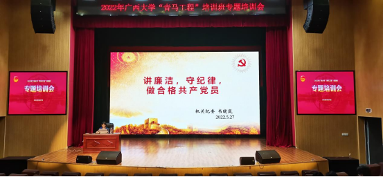 为扎实推进“青马工程”,引导青年学生骨干铸牢理想信念,坚持正确方向,坚守廉洁纪律,争做合格党员,5月27日,校团委邀请机关党委纪委书记韦晓岚同志为2022年“青马工程”学员做了题为《讲廉洁,守纪律,做合格共产党员》的专题培训,从党的反腐败斗争史、我国党风廉政建设和反腐败斗争的成效和经验、对青年党员的纪律要求三个方面,为“青马工程”学员上了一堂生动的培训课。