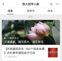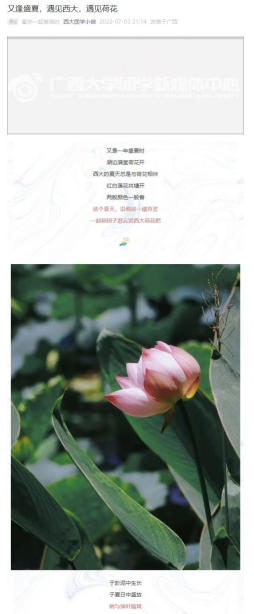 荷花是我校“校花”,学校荷花的数量、品种繁多,美不胜收,是校园里一道独特的风景线。校团委以荷花为原型,设计“小荷”、“荷团子”等深入人心的卡通形象及系列网络文化产品,并发布《又逢盛夏,遇见西大,遇见荷花》等系列原创推文,大力弘扬和传播清廉、慎独、高雅的荷花精神。