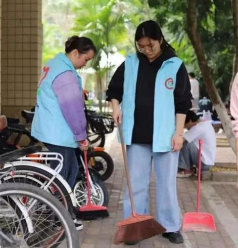 林学院团委组织志愿者打扫学院、清理宿舍环境、整理共享单车等,为校园整洁贡献自己的一部分力量。