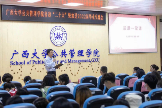 聂书记的最后一课,代表全院领导和老师向毕业生们送出临别祝福,助同学们扬帆远航一臂之力。第一,要克服焦虑,高效行动 ,要有提前的规划和迎难而上的勇气。第二,要突破迷茫,稳步前行,在以后的生活坚持终身学习的习惯、保持宽广豁达的心态、践行宁静致远的处人方式。第三,要拒绝躺平,保持进步的朝气,要“积极内卷”,通过努力实现自己心中的梦想,在竞争中提升自己的实力。言有尽而情不断,激情的告别是为了更好的再见,公共管理学院永远欢迎每一个人,祝毕业生们平平安安、前程似锦、聚散有时、未来可期!