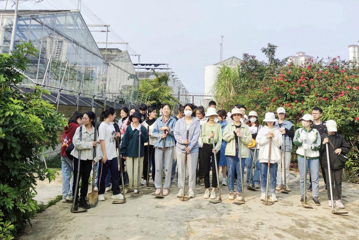 (园艺201班团支部全班同学一起打扫实验基地)