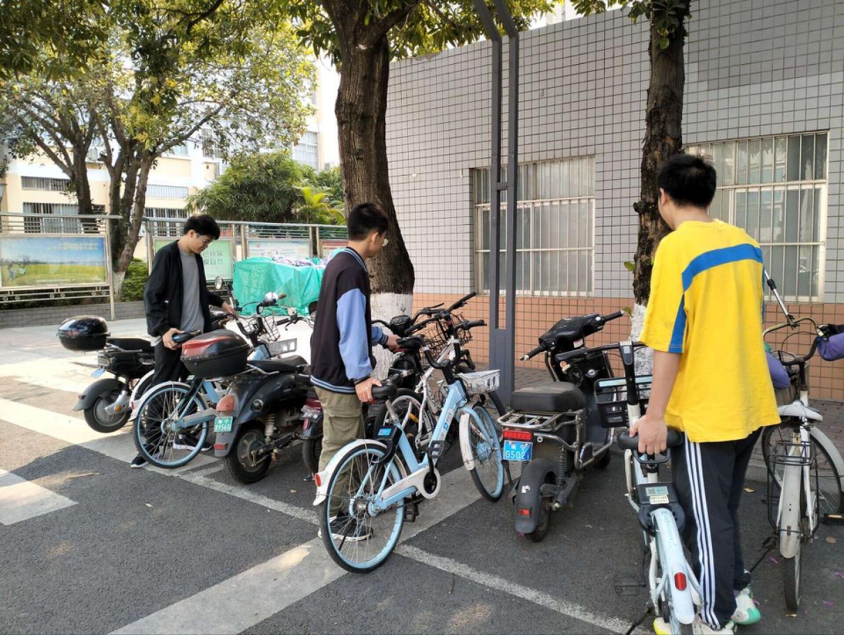(植产224班团支部的同学将路上乱放的自行车摆好)