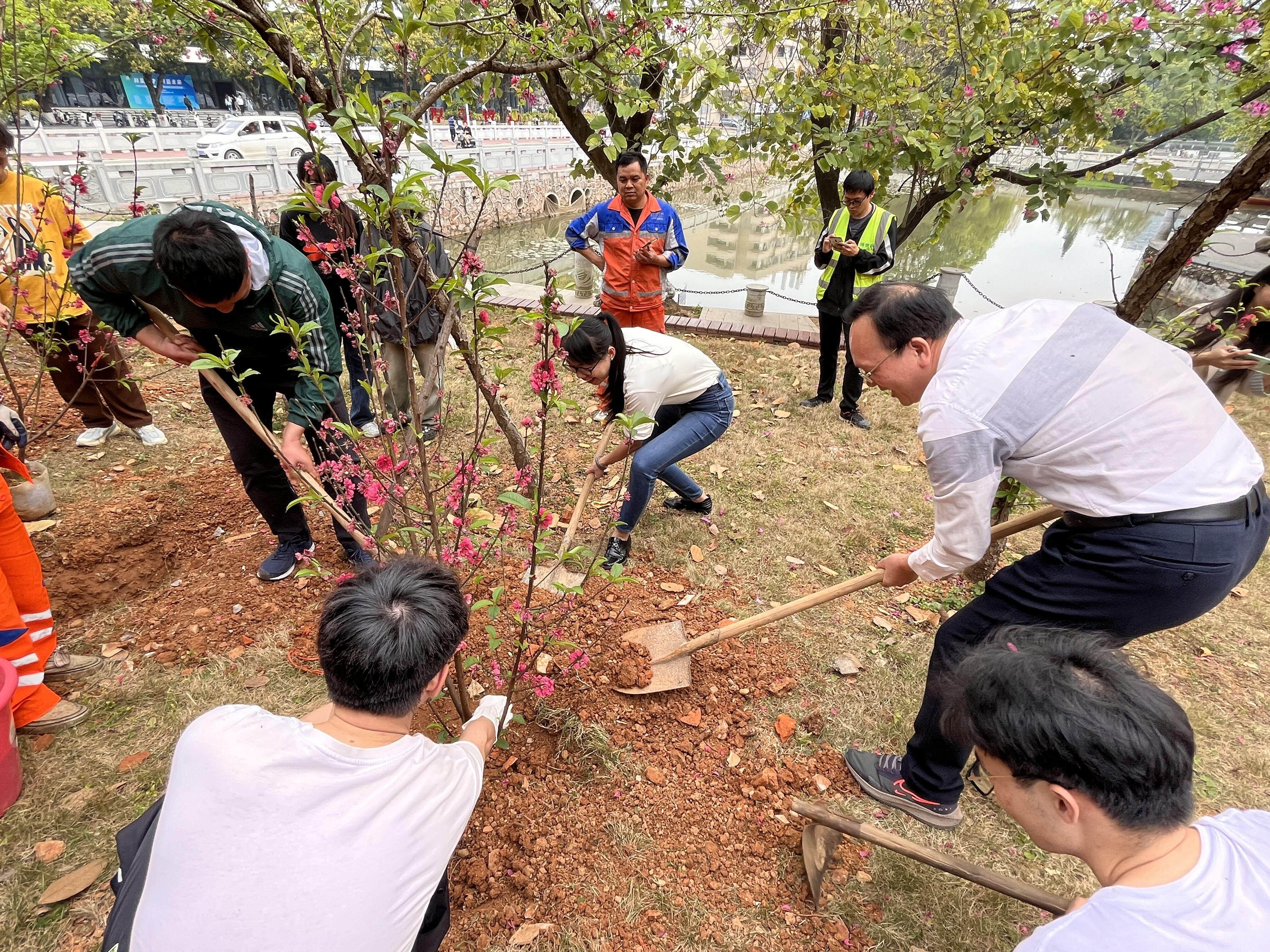 在校友林植树现场,校友代表广西国有大桂山林场吴秦展副场长与我院师生三十余名志愿者等共同种下十棵象征绿色希望的桃花幼苗,为西大的春天增添了一抹亮色。活动伊始,和太平教授鼓励同学们参与校园绿化活动,把义务植树作为一种文化传承,当作一份责任担当,强化师生爱绿、护绿、植绿的生态文明意识,珍惜发展成果,努力做生态文明建设的实践者、推动者。随后,校友广西国有大桂山林场吴秦展副场长表示,本次活动为广大同学提供了参与生态环境建设的机会,希望同学们继续牢固树立绿水青山就是金山银山理念,为广西乃至全国的林业建设做出贡献。