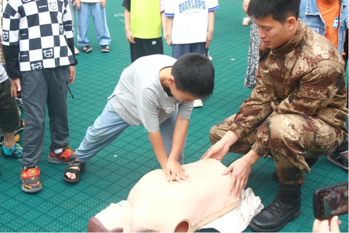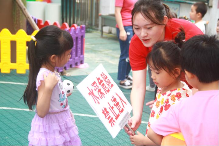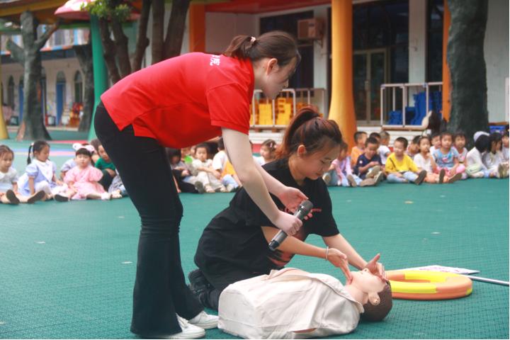 在防溺水的宣传中,志愿者积极与小朋友们进行互动,宣传游泳六不准知识,加强了小朋友们的防溺水意识。体育学院吴潮培老师向二幼师生现场教学溺水后的急救措施,提高了师生面对溺水紧急情况的应对能力。