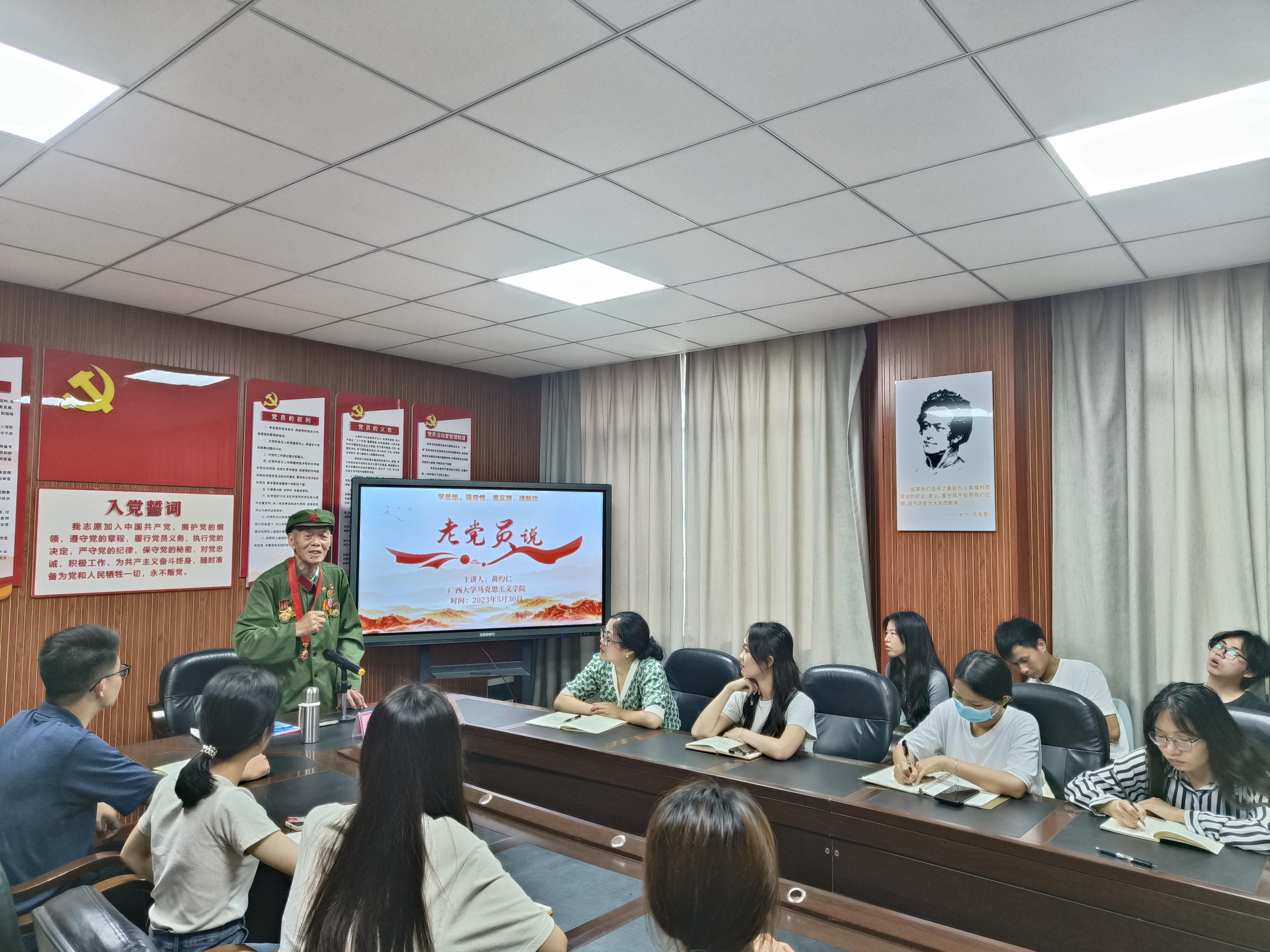 为深入开展学习贯彻习近平新时代中国特色社会主义思想主题教育,引领广大青年党员向英雄先辈学习,自觉传承红色基因,赓续精神血脉,坚定不移听党话感党恩跟党走,5月30日,马克思主义学院举办“老党员说”主题沙龙活动。本次活动主讲人为我校退休老党员、抗美援朝及抗美援越老战士黄灼仁。