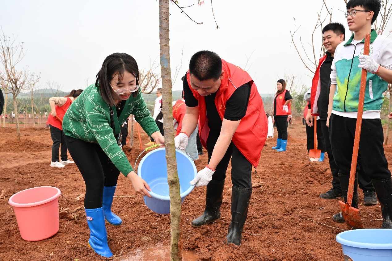 植树现场,大家热情高涨,齐心协力,按照分组有条不紊地开展植树工作,扶苗入坑、挥铲填土、提桶浇水……每道植树工序都做得认真细致,现场呈现出一片热火朝天的劳动景象,一株株新种下的樱花迎风挺立、错落有致。