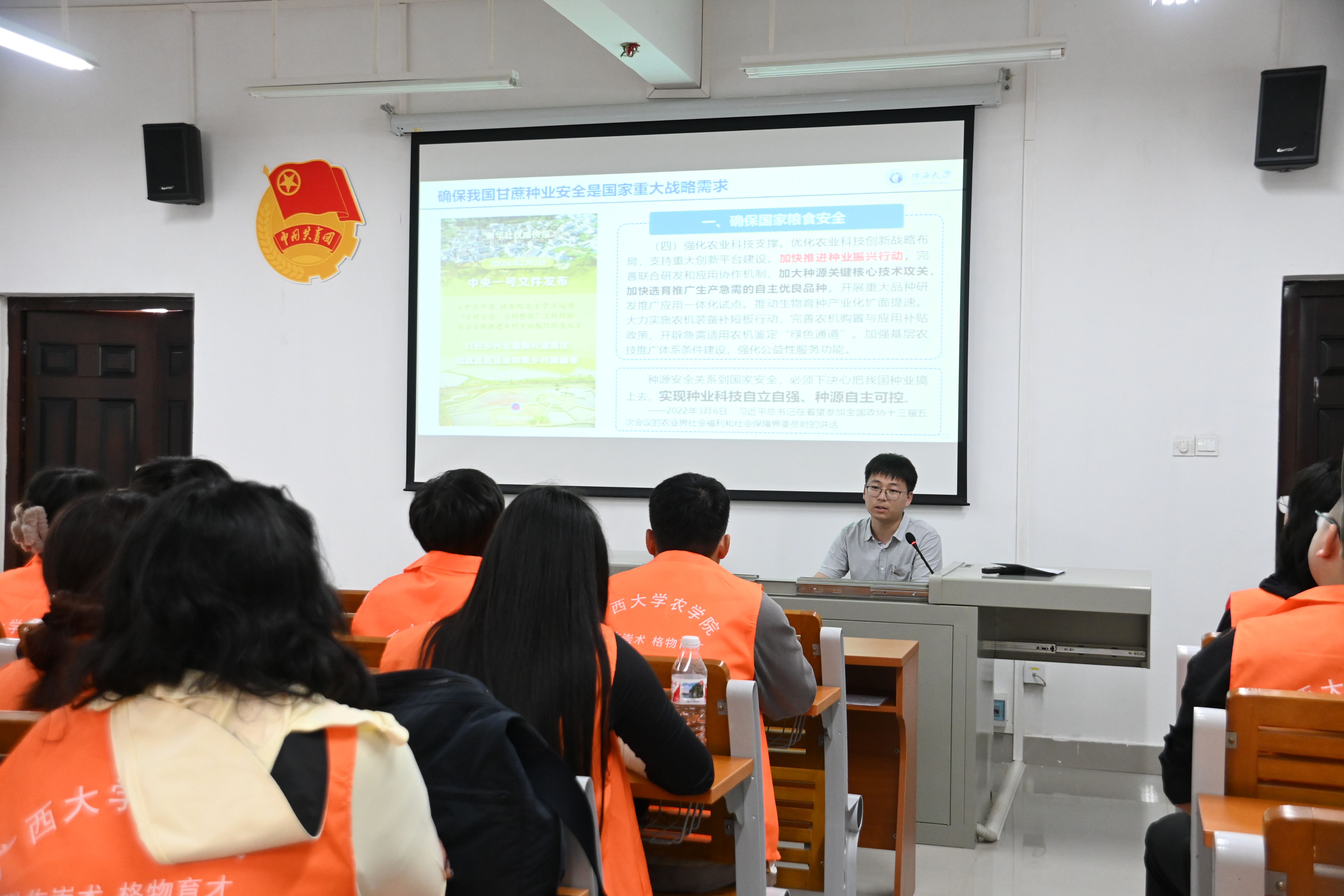 4月11日,团支部全体团员在广西亚热带农科新城上了一堂内容丰富、形象生动的总体国家安全观主题团课。在课堂上,作为科技人员代表参加了习近平总书记在广西来宾考察调研的博士后李珍和博士生李艺寒等嘉宾进行了领学。李艺寒说:“种源安全与国家安全息息相关,我们必须牢牢把种业自主权掌握在自己手里。甘蔗作为我国主要食糖来源,关系到国计民生,我们应该重视甘蔗种源安全。”他向团员们分享了去年十二月份跟随习近平总书记到广西来宾调研的经历,习近平总书记在甘蔗地里的讲话,现在还非常清晰的刻在他的脑海里,“习近平总书记对甘蔗产业的关注、对蔗农生活的关心、对食糖产量的重视,以及对于科技工作者在甘蔗良种繁育和推广中做出的贡献表示的肯定,也进一步点燃了我从事甘蔗生物育种这份“甜蜜事业”的激情,也坚定了我将人民的‘糖罐子’装满的决心。希望更多农科学子能为我国甘蔗产业的发展和糖业安全贡献自己的一份力量。”